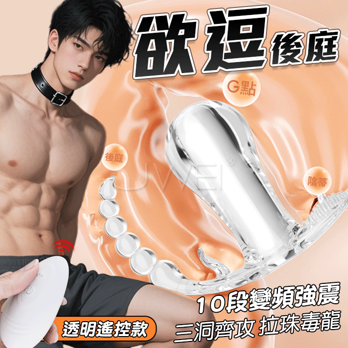 欲逗.10段變頻強震 三洞齊攻拉珠毒龍舌舔撩撥後庭按摩器【透明遙控款】