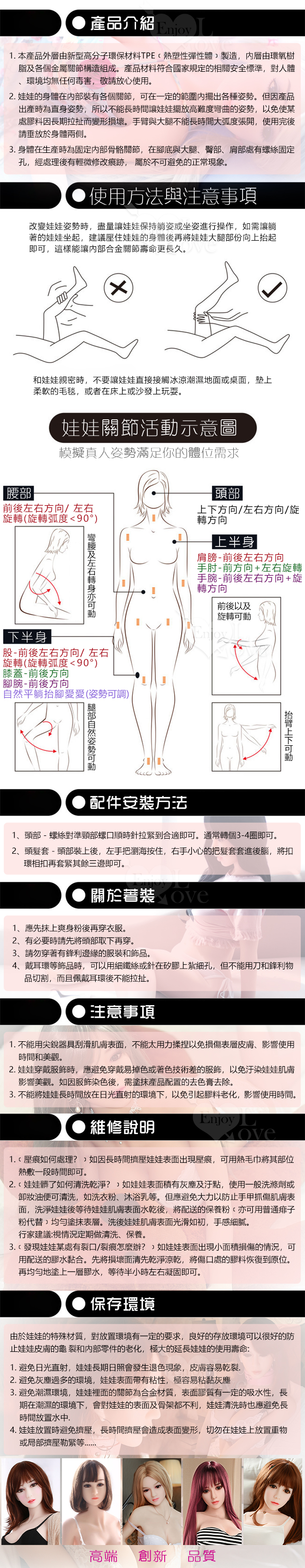 使用部位:陰交、肛交、口交、乳交四種性交用法,內置合金骨骼可固定姿勢,關節可動,可隨意變更姿勢
