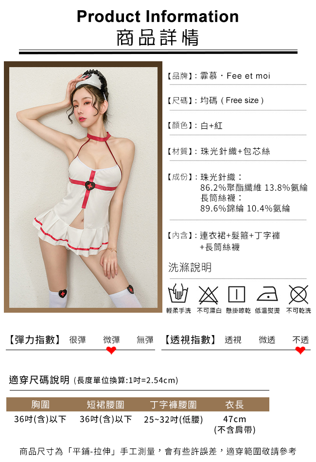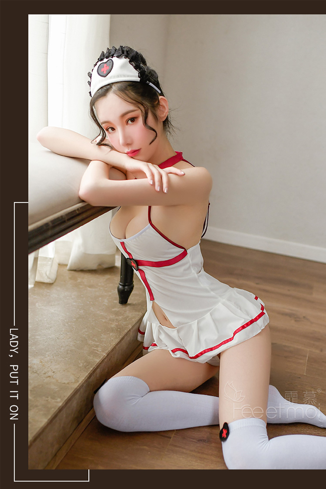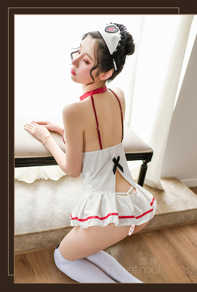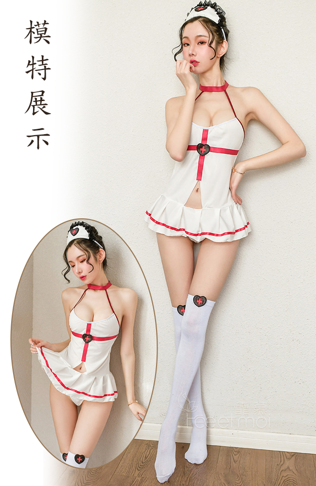 護士角色扮演服!掛脖低胸十字愛心短裙四件式套裝﹝白﹞