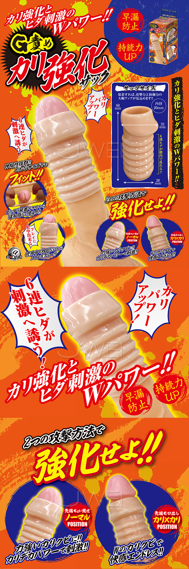 6連ヒダが刺激へ誘う・・・人気の男性用サポートグッズ、G責めシリーズに新しい仲間が加わりました。装着方法が2種類あるので、相手に合わせて攻撃方法を選べる。伸縮性抜群の素材なのでしっかりフィット。激しい動きでも外れないから、ストレスフリーで使用可能。攻守使える万能サックで、自分自身を強化しよう!!