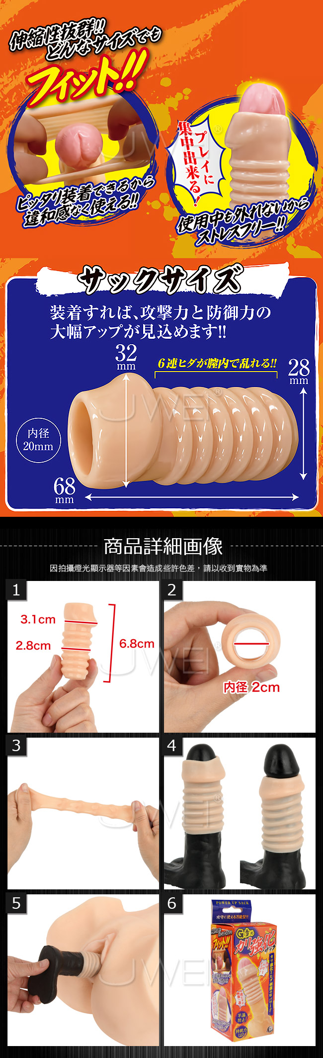 ■日本A-ONE原裝進口,品質優良 ■全長68mm カリ部最大幅32mm サオ部最大幅28mm 内径20mm ■6連ヒダボディ ■早漏防止 ■持続力UP