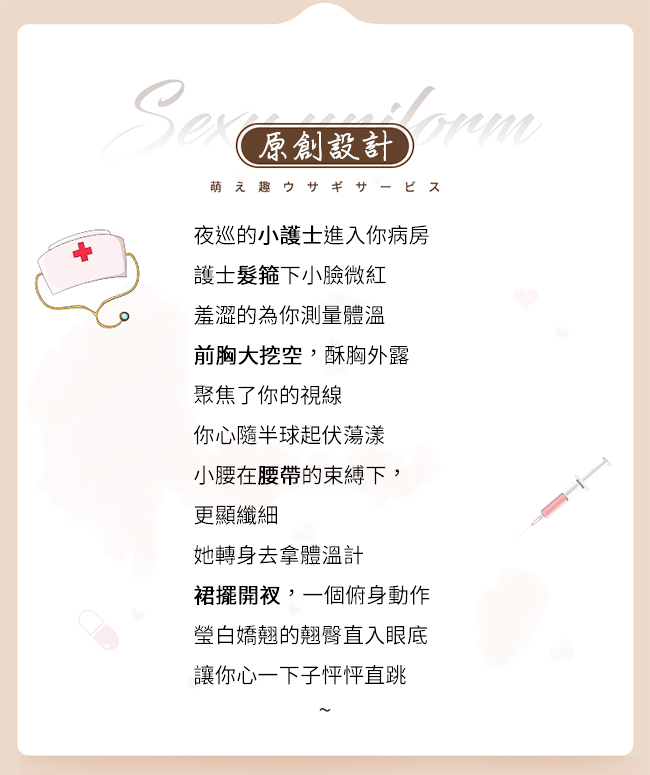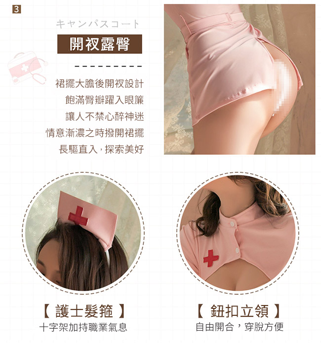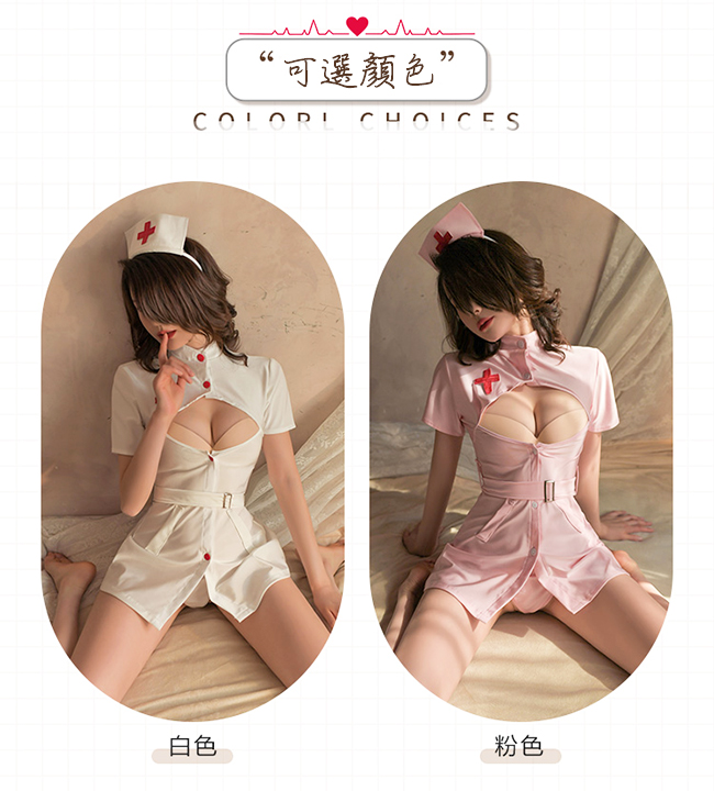 護士角色扮演服!立領挖空露乳修身束腰後開衩裙襬四件式套裝﹝粉﹞
