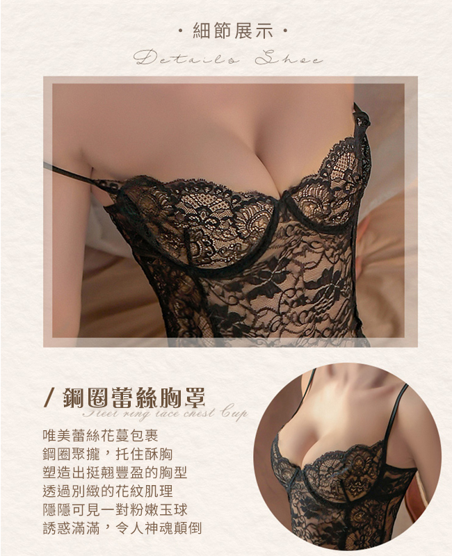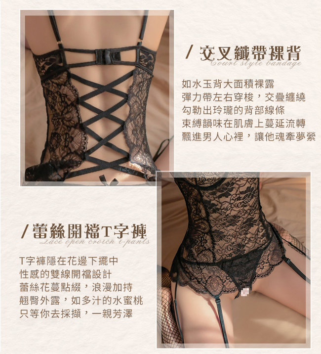►您現在的位置:首頁>情趣吊襪帶!鋼圈聚攏美胸後交叉裸背蕾絲開襠褲含襪三件組﹝黑﹞