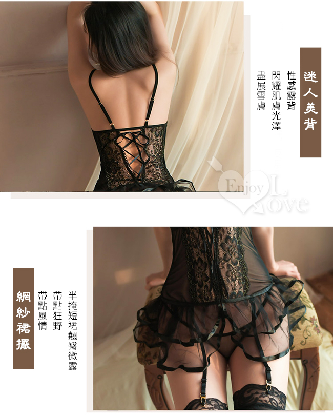 | 情趣馬甲裙!宮廷風V字交叉細帶透視澎裙吊襪帶三件組﹝黑﹞