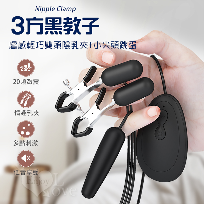 Sex party 3方黑教子 ‧ 20頻激震虐感輕巧雙頭陰乳夾+小尖頭跳蛋﹝舒適硅膠+磨砂親膚﹞