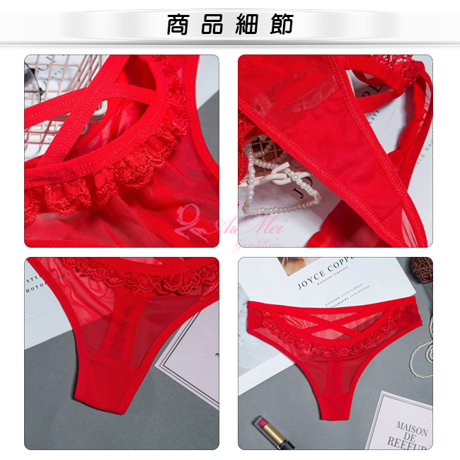 溫柔暗號!前交叉細帶滾邊蕾絲網紗中腰T字褲﹝紅﹞