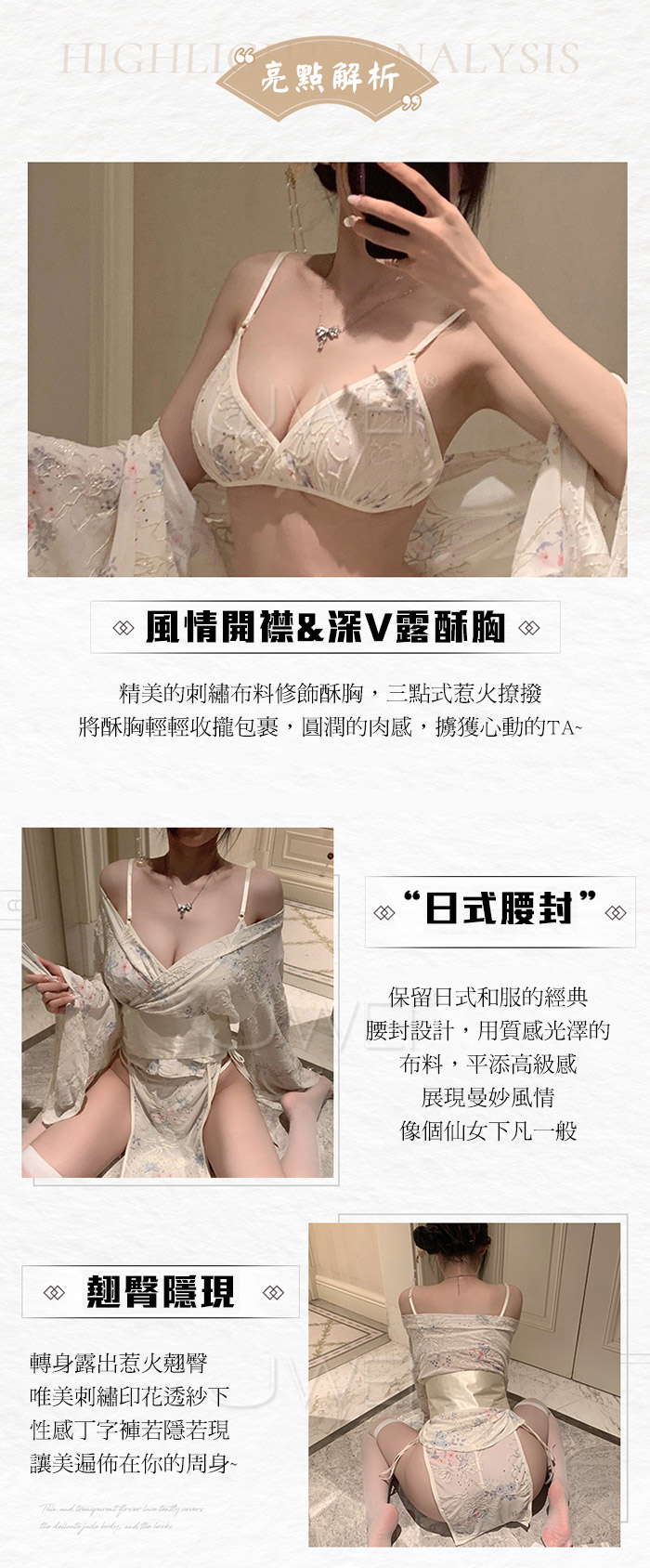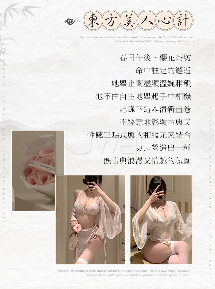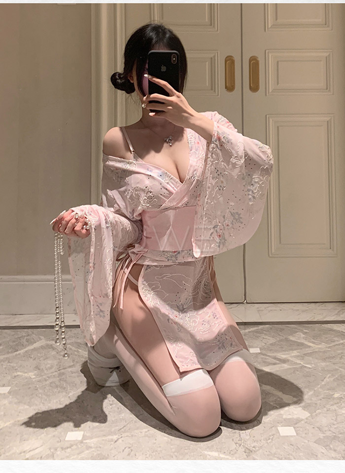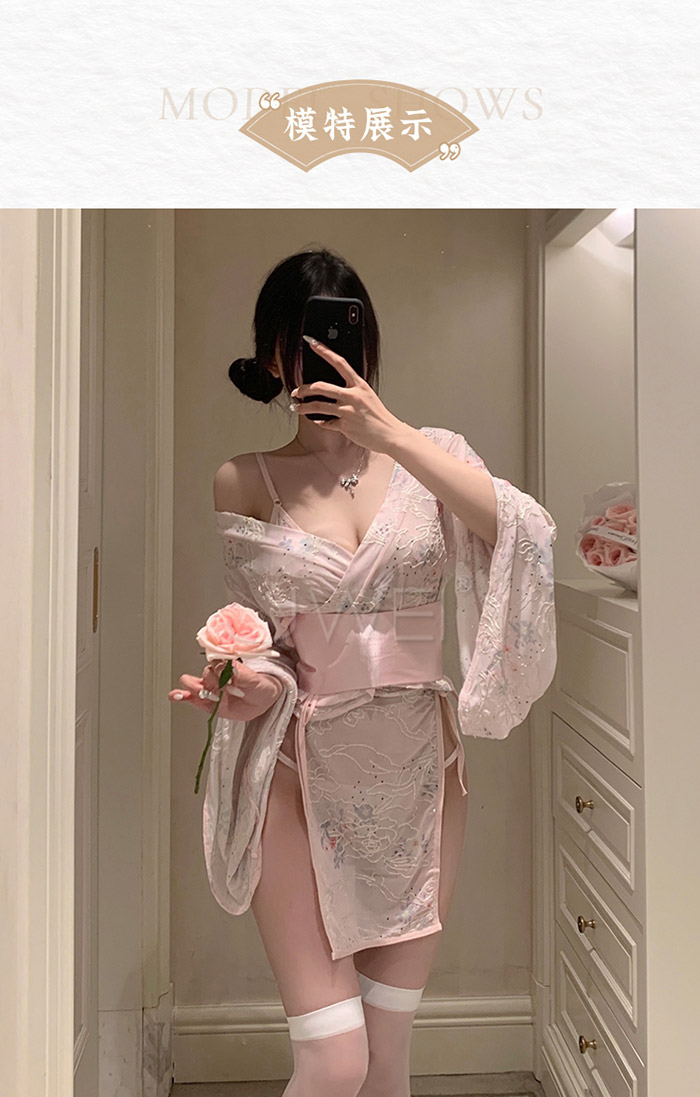 首頁>春日櫻花.風情開襟露胸微透日式和服套裝-粉色【外套+胸罩+T褲+腰封+分片裙*2】