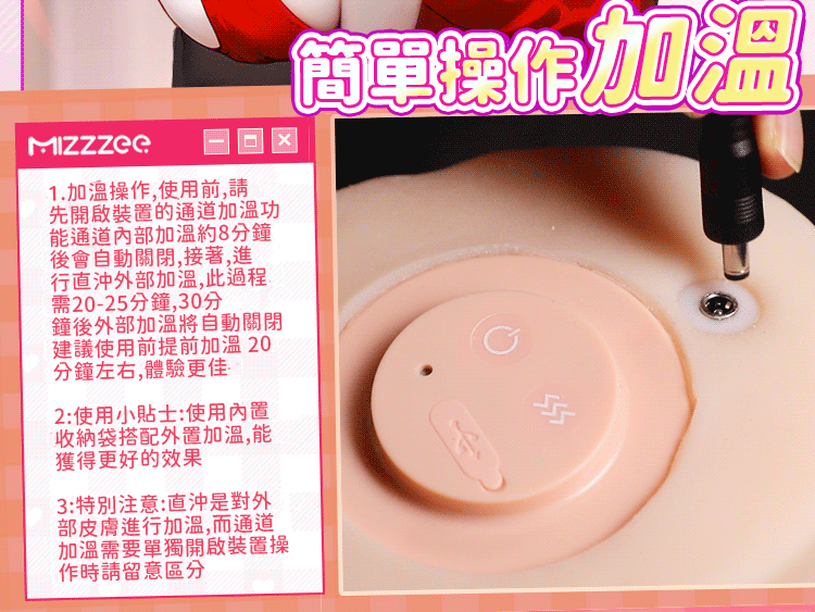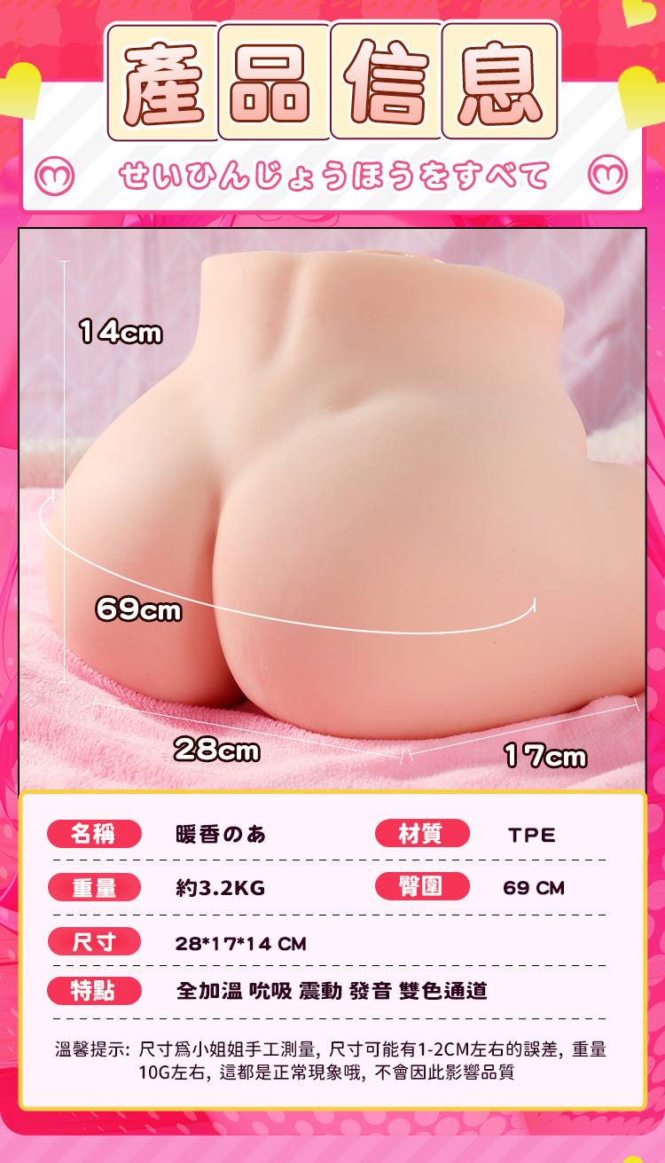 品牌:謎姬 產品名稱:暖香 產品尺寸:28*17*14 產品裸重(KG):3.2 材質:TPE 單雙通道:單 是否貫通:否 是否帶潤滑:是 產品著色:逼真著色 骨架鐵絲還是不鏽鋼:無 顏色:肉色 含包裝尺寸:25*27*17 附包裝重量:3.5 控制類型:自動 查詢防偽:謎姬 產品配置:小包6毫升潤滑 產品賣點:雙色通道,全加溫模式