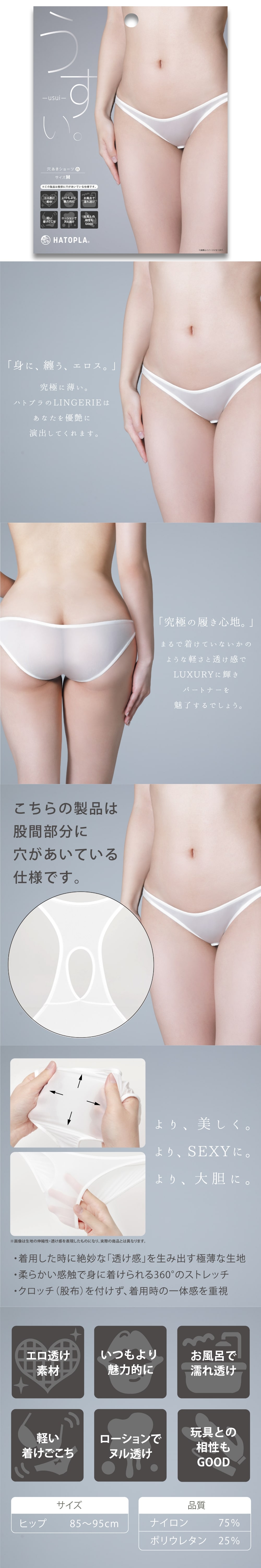 《うすい。-usui- 穴あきショーツ(白)》 「身に、纏う、エロス。」究極に薄い。 ハトプラのLINGERIEはあなたを優艶に演出してくれます。 より、美しく。より、SEXYに。より、大胆に。 まるで着けていないかのような軽さと透け感で LUXURYに輝きパートナーを魅了するでしょう。 恥ずかしく…大胆に。輝かしく…上品に。サイズ:ヒップ85~95cm /品質:ナイロン75%・ポリウレタン25% 「穿在身上的性感」超薄。 HATOPURA的LINGERIE能把你的身材體現的更妖艷。 更美。更性感。更大膽。 如同沒有穿一樣的穿透感能更吸引你的另一半。 含羞…但更大膽。更優雅的閃耀。尺寸:臀圍85~95cm