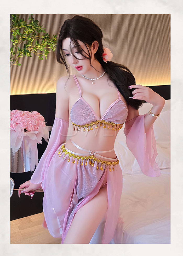 情定西域.異域風情復古亮片拼接裙擺角色扮演服-粉色【胸罩+短裙+T褲+袖子*2】