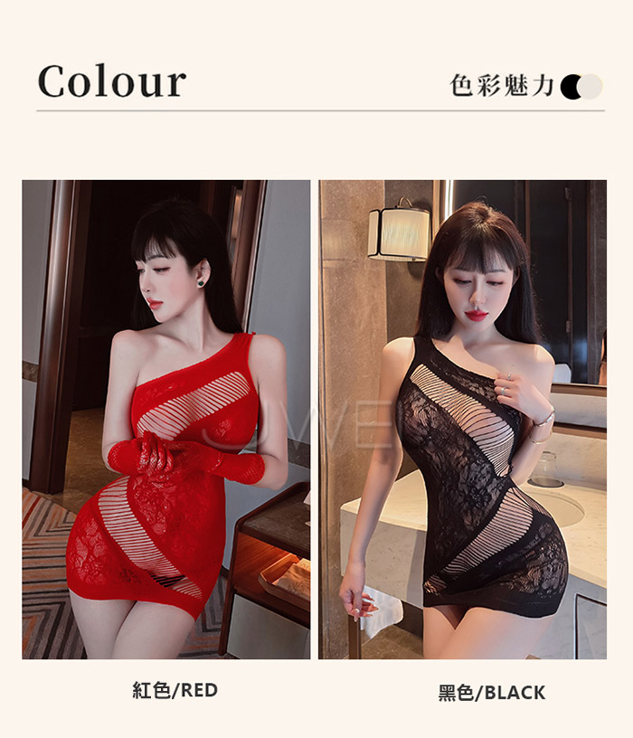 | 魅惑乳香.斜肩鏤空露乳半遮蜜桃包臀網衣-紅色【單件網衣+紅色網眼手套】