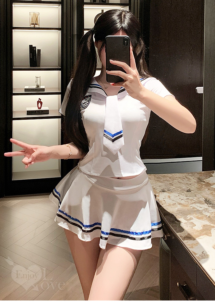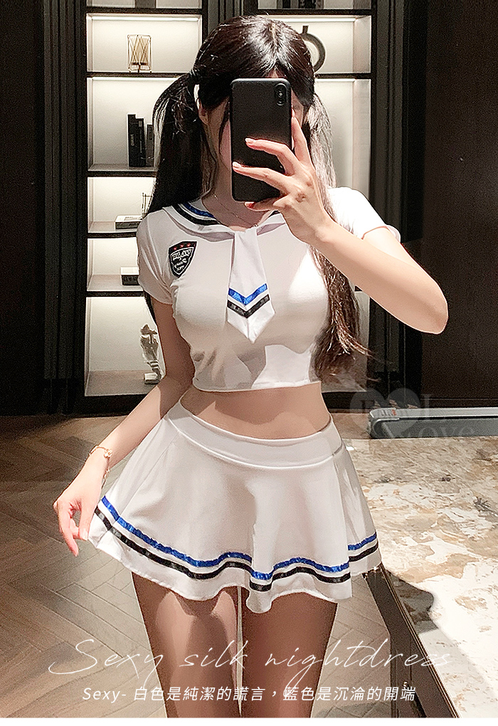 ►您現在的位置:首頁>學生角色扮演服!純白大方水手領露腰短版上衣 × 條紋短裙三件組
