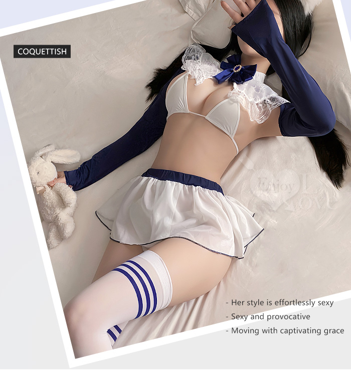 ►您現在的位置:首頁>「學院藍絲」立領花邊比基尼 × 透紗露臀小短裙 裸背含襪三件組
