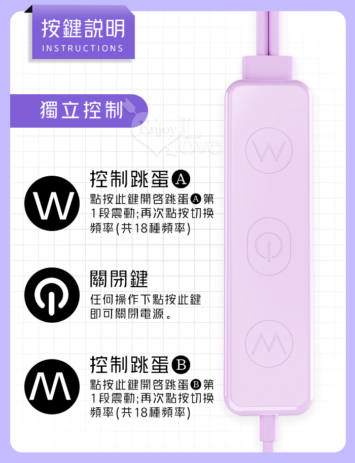 ►您現在的位置:首頁>ROSELEX 勞樂斯 ‧ 雙圓跳蛋 18頻調控強震入體雙跳蛋﹝內外刺激+USB直插供電+雙邊可獨立控制﹞淺紫